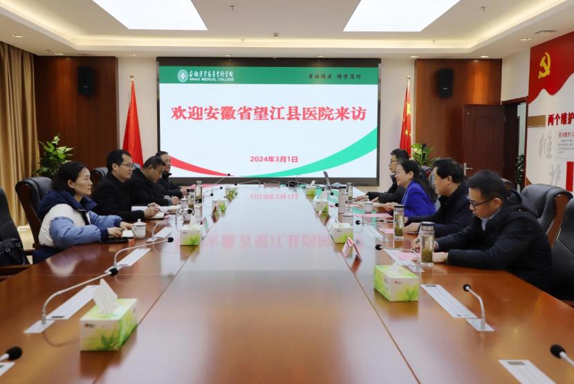 3月1日下午,安徽省望江县医院院长曹玉华等一行来校调研交流。开云官方端网站登录入口党委委员、副校长王润霞、严继贵等校领导接待。双方开展座谈交流。