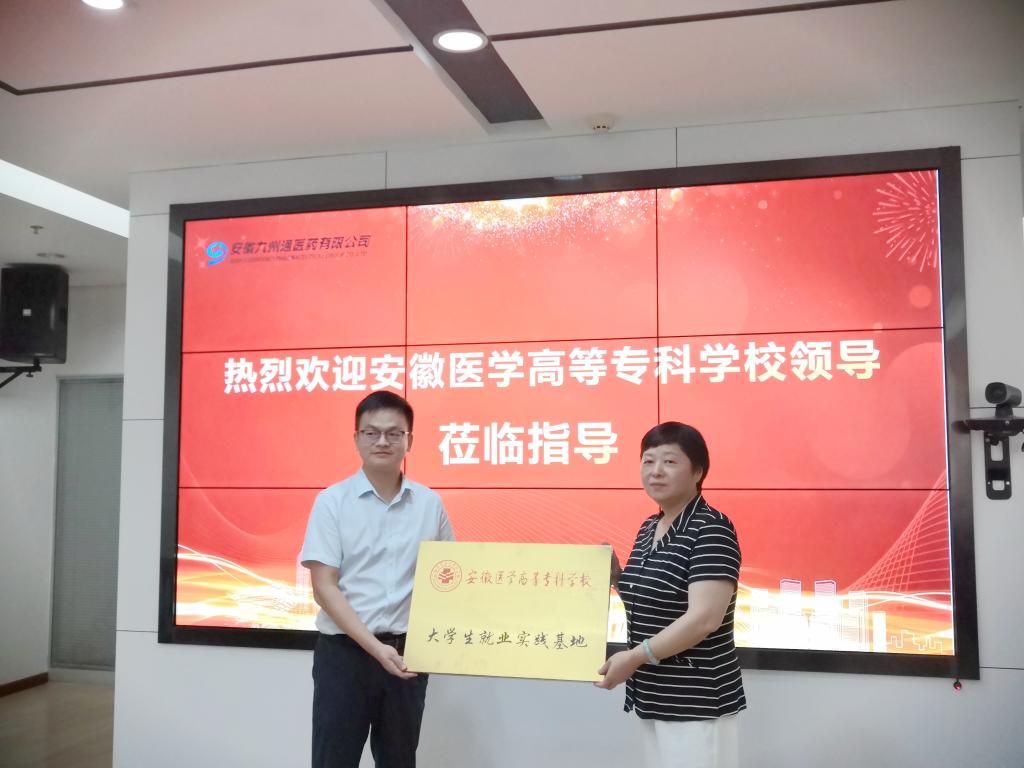 为深入贯彻落实教育部“高校书记校长访企拓岗促就业”专项行动工作要求,充分挖掘毕业生就业资源,实现毕业生更高质量更充分就业,7月5日上午,校党委书记董亚杰带队,校党委委员、副校长王润霞,药学院负责人及骨干教师等一行六人赴安徽九州通医药有限公司考察交流,受到公司党委书记、物流公司总经理祝志红,企管总监刘志松等热情接待,双方进行了座谈交流及“安徽医学高等专科学校大学生就业实践基地”授牌仪式。