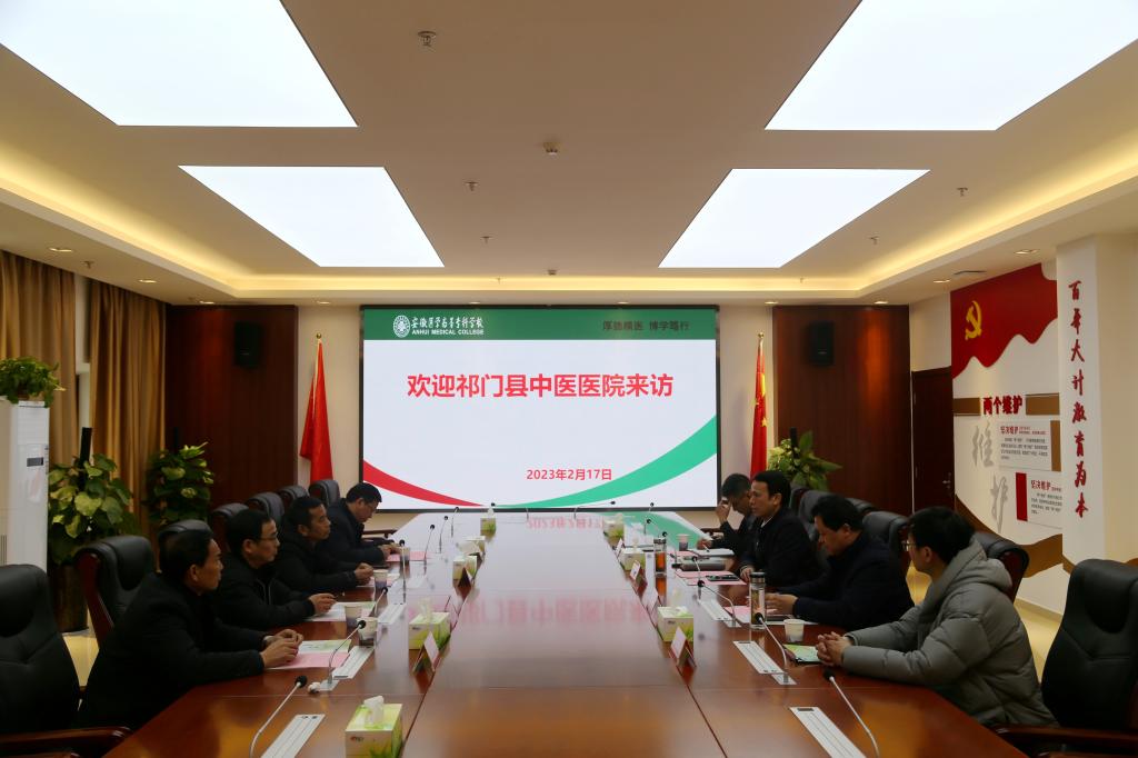 2月17日下午,祁门县中医医院院长冯淼鑫、党委书记戴晖、副院长吴小辉等一行4人来校交流。校党委副书记、校长郑为超,校党委委员、副校长严继贵在护理楼三楼会议室会见来宾。