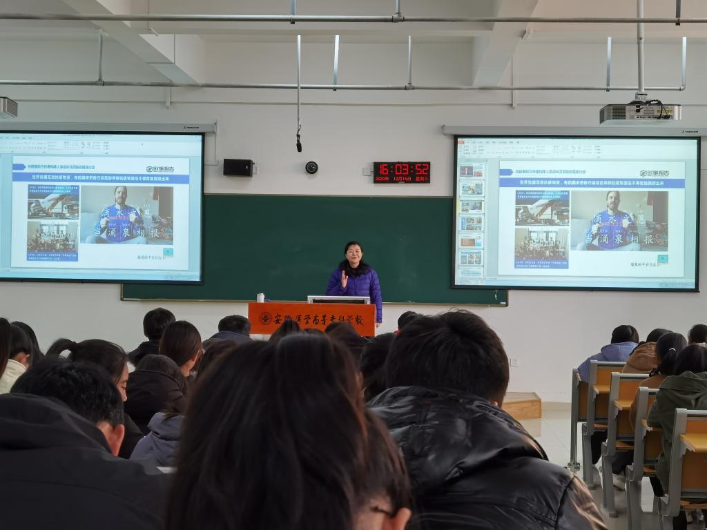 12月16日下午,校党委委员、副校长王润霞以“携手共建人类命运共同体”为题,结合疫情中的中国行动,为2020级医学检验技术1、2班同学讲授《形势与政策》课。
