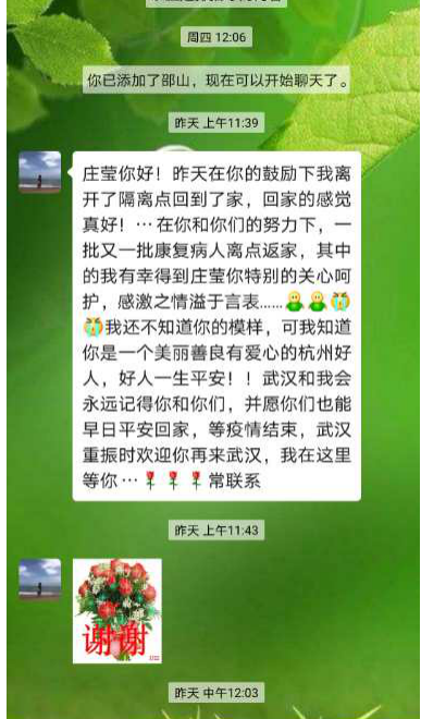 老吾老以及人之老,幼吾幼以及人之幼。在日常工作中,庄莹医者仁心,视留观人员为亲人,通过微信群播报天气、转发暖心微视频等方式激励隔离人员以积极心态面对暂不确定的等待过程,给予患者心理和情感支持。14岁的初三学生王扬(化名)父母都因确诊被收治,看着孩子情绪低落,庄莹每天多次到他房间,送去酸奶、水果等食物,促膝长谈,帮他与父母视频连线。她写小纸条鼓励孩子:“别害怕,困难是暂时的,就把我当成你姐姐”。独自在隔离点的老人黄女士心中,庄莹就如同女儿。工作之余,庄莹时常守护在老人身边,嘘寒问暖,充当跑腿。得知老人生日,庄莹和同事们自发组织为老人过寿,老人的女儿得知后连连发来微信感谢:“太感谢你了,要不是你在,我实在不知道我母亲该如何是好”!
