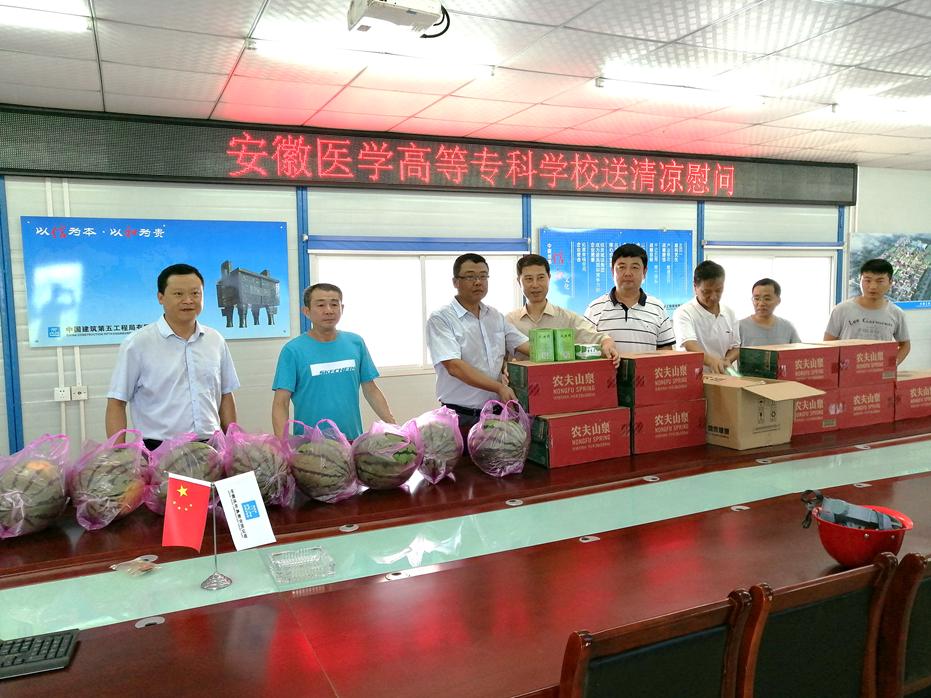 刘东义强调,新桥校区建设一期工程已经进入收尾阶段,正值高温天气,各参建单位要调整工作时间,错峰施工,备齐药品,既要保证工期进展顺利,又要确保人员健康安全。校工会向新建办和各参建单位赠送了藿香正气水、风油精等防暑降温药品和西瓜、矿泉水等物资,向新建办及所有参建人员表示慰问。校党委委员严继贵向刘东义书记一行表示感谢,并表示将再接再厉,奋战最后数十天,确保新桥校区建设一期工程顺利交付使用。